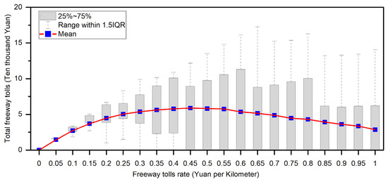 As Figure 2 and Figure 3 shows, freeway travel demand decreases as toll rates increase, and tolls show “synchronous phases” and “asynchronous phases” as toll rates increase, which is basically consistent with the findings of existing theoretical studies. In the lower toll rate “synchronous phase,” the increase in toll rates reduces travel demand to a certain extent, but the impact of the increase in toll rates outweighs the impact of the decrease in travel demand, so the overall tolls show an upward trend. In the higher toll rate “asynchronous phase,” further toll rate increases also reduce travel demand, but the impact of increased toll rates is weaker than the impact of decreased travel demand, resulting in a decrease in overall tolls. In the results from the simulation, the experimental scenario when the toll rate of CYN 0.45 per kilometer is used, the average freeway toll taken to reach the maximum value is CYN 58.9 thousand. Obviously, in theory, there exists a toll rate interval that makes the freeway tolls the highest. In addition, different toll rates can lead to different travel demand; however, there could be situations with the same freeway toll, such as when the toll rate is CYN 0.3 per kilometer and CYN 0.6 per kilometer, respectively. Here, the freeway user share is 55.94% and 28.47%, respectivley, but the corresponding freeway tolls are very similar to each other, at CYN 53.7 thousand and 53.6 thousand, respectively.
