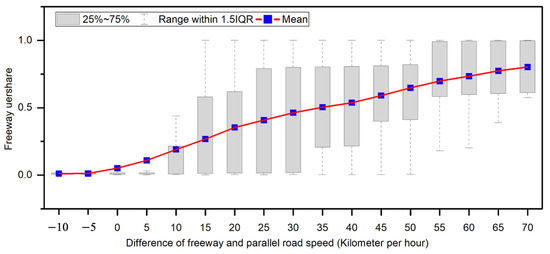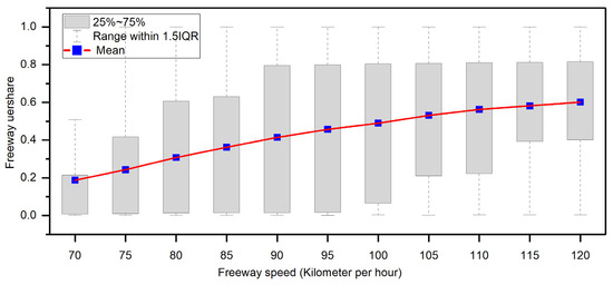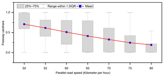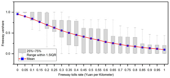 where CF and VF denote the cost and speed of the freeway and Cp and Vp denote the cost and speed of the parallel road. Rate represents the toll rate of the freeway, which we set between CYN 0 and 1 per kilometer. Dis is the travel distance and Inc refers to the monthly income. γ is the modifying factor, as the time spent on the journey might be more “expensive” than the average value denoted by , that is, the ratio of monthly income to monthly working hours.