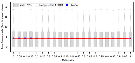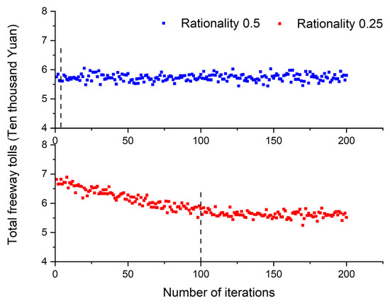 The rationality level varies in the interval of 0–1 while the tolls remain basically unchanged, as shown in Figure 4, which shows that the rationality level does not have a significant direct effect on the tolls. The main reason for this lies in the fact that the tolls in this study are defined as the average of the freeway charging in the last 600 s of the simulation to ensure that the value is stabilized. However, as shown in Figure 5, the degree of rationality affects the velocity at which tolls gradually reach a steady state from an initial state, i.e., the higher the degree of rationality, the less time it takes to reach a steady state. At the toll rate of CYN 0.45/km, the speed of the freeway is 120 km/h, and the speed of the parallel national and provincial arterial roads is 80 km/h; moreover, when the degree of rationality is 0.25, it takes 100 iterations of simulation for the toll to reach the steady state from the initial state, while, when the degree of rationality is 0.5, it takes only 10 iterations or less to reach the steady state. As a result, the degree of rationality does not affect the value of tolls in the steady state, but instead affects the time required for tolls to reach the steady state.