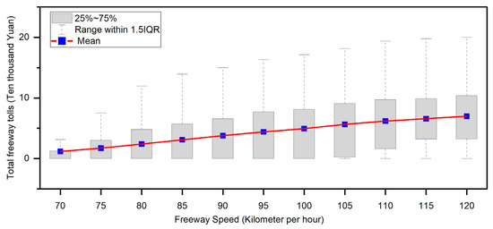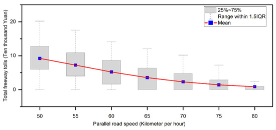 Theoretically, due to the competitive relationship between freeways and parallel national and provincial arterial roads, given all other conditions alike and the higher speeds of freeways and the lower speeds of parallel national and provincial arterial roads, the number of users choosing to travel on the freeway will increase, and, thus, freeway tolls generally increase. As shown in Figure 6, Figure 7, Figure 8 and Figure 9, The simulation results are consistent with the above basic understanding. Remarkably, increasing freeway speeds beyond 110 km/h will have an attenuating effect on the freeway user share and the total tolls for freeway trips. Similarly, when we increase the speed of parallel state and provincial arterials over 70 km/h, the depressing effect on the freeway user share and total freeway tolls decays. From this, in conditions where the toll rate and other conditions remain unchanged, the freeway tolls can be increased through speed management and other means (such as limiting low speeds) to reduce the cost of freeway travel. For heavily congested road sections, we can increase the parallel national and provincial arterial roads’ speed to absorb part of the highway travel demand, thus achieving the goal of congestion relief.