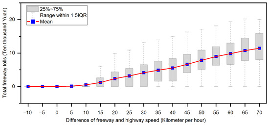 Moreover, the difference in speed between the freeway and the parallel national and provincial arterial roads is also correlated with the freeway travel demand and tolls. Theoretically, under the same conditions, the larger the speed difference between the freeway and the parallel road, the more attractive the freeway is, and its travel demand and tolls will be larger. The simulations shown in Figure 10 and Figure 11 verify this theoretical result. Furthermore, we find that when the speed difference between the freeway and the parallel road is less than 5 km/h, the growth of the speed difference will not have a positive contribution to the freeway toll collection. This shows that the parallel national and provincial arterial roads still have an advantage in attracting passenger traffic. In practice, it can be understood that, although freeway speeds are slightly higher than those of parallel roads, the accessibility of the freeway is relatively low due to its full closure nature, and the cost of getting to the freeway and entering and exiting the toll booths overrides the speed advantage of the freeway. Hence, in addition to improving the speed advantage of freeways, improving the accessibility of freeways can somehow increase the demand for freeway travel, which in turn can increase the toll revenues of freeway operators.