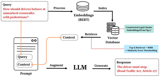 Retrieval-augmented road traffic-related laws and regulations processing pipeline. This figure illustrates the retrieval and query–answer generation process. Road traffic-related laws and regulations documents are retrieved using transformer attention-based similarity adjustment and multi-stage filtering (Section 3.2) to construct a structured road traffic legal context. The retrieved context is injected into the prompt, enabling the LLM to generate legally grounded responses (Section 3.3).