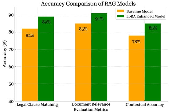 To further assess the effectiveness of our proposed method, we evaluate the accuracy improvements across three key metrics: road traffic legal clause matching, document relevance, and contextual accuracy. Figure 3 presents a comparative analysis between the baseline BERT-based model and the LoRA-enhanced RAG model.