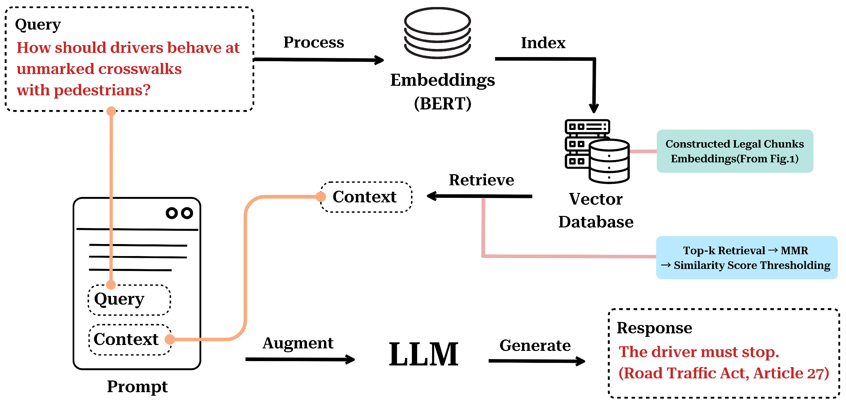 - We integrate context-augmented query response generation to ensure that retrieved road traffic-related laws and regulations effectively guide language model outputs. This approach enhances the consistency and road traffic legal compliance of generated responses.