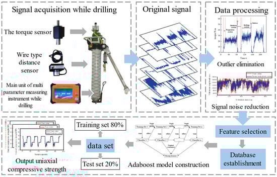 The 112,206 return air passage of the No. 1 coal mine operated by Shaanxi Xiaobaodang Mining Co., Ltd., Yulin, China. is situated within the coal seam of the 11th panel of the second coal seam, with the 112,206 working face oriented to the west. The cross-section of the roadway is rectangular, and the support method employs a combination of anchor mesh, cable, and beam support. The lithology of the immediate roof of the 112,206 return air channel consists of siltstone, with a rock thickness ranging from 1.041 to 1.85 m and an average thickness of 1.45 m. The basic roof is composed of medium-grained sandstone, which locally transitions to coarse-grained sandstone, exhibiting a rock thickness between 18.92 and 25.9 m, with an average thickness of 22.41 m. During the tunnel excavation and support process, numerous anchor cable boreholes are constructed. The drilling process involves the interaction between the drilling tool and the rock mass. The drilling signal serves as the physical feedback from the drilling tool, and fluctuations in this signal occur in the weak areas of the surrounding rock during drilling. The dynamic characteristics of the drilling device can be used to assess the condition of the tunnel’s surrounding rock. In this study, ideal data are obtained by capturing the drilling signal, preprocessing and denoising the original data, and then performing feature selection to establish an AdaBoost model for predicting the strength of the coal and rock mass. The overall scheme is illustrated in Figure 1.