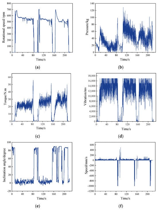 Raw data of drilling signals. (a) Rotational speed signal; (b) pressure signal. (c) torque signal; (d) vibration signal; (e) inclination angle signal; (f) speed signal.