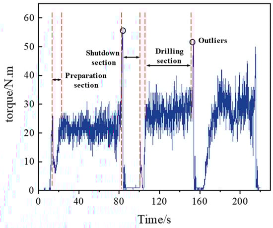 The process of utilizing a drilling rig to create holes for anchor rod and cable support in underground coal mines can be categorized as the “rod installation, rising, drilling, lowering, and rod installation” stage, with the drilling process occurring cyclically. Based on six types of logging while drilling (LWD) signal data—namely, rotating speed, pressure, torque, vibration, dip angle, and speed—collected during field drilling, the characteristics of certain torque signals gathered in the time domain are illustrated in Figure 3. In practice, the operational process can be divided into three sections: the shutdown section, the preparation section, and the drilling section. The shutdown period refers to the cessation of drilling rig operations for rod installation and unloading. The preparation stage occurs when the drilling rig ascends to the rock surface and then descends to the bottom. The drilling section pertains to the rock-breaking process, during which the drilling rig makes contact with the rock surface through rotation and pressurization. A crucial step in establishing an intelligent prediction model for the strength of surrounding rock is analyzing the interaction data between coal and rock generated during the contact process between the drilling rig and the coal rock. Consequently, this article first eliminates data from the shutdown and preparation stages of the original dataset, retaining only the data from the drilling section.