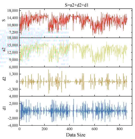 The wavelet transform filters the original time series signal using both low-pass and high-pass filters to obtain the corresponding low-frequency and high-frequency components. The low-frequency component represents the primary characteristics of the original signal, capturing its overall trend, while the high-frequency component contains the details or variations of the signal, often reflecting short-term fluctuations. Firstly, the signal s(t) is transformed by wavelet denoising. Wavelet transform decomposes the signal into wavelet coefficients with different scales and frequencies, which are expressed as follows: