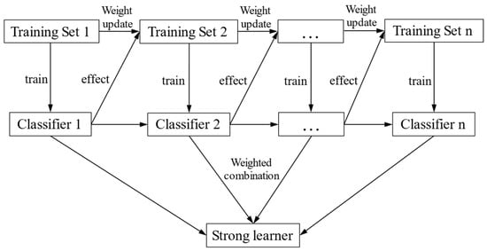 Algorithm principle: (1) Initialize the weight distribution of the training data: for N samples, the initial weight of each sample is uniform and set at 1/N. (2) Train a weak classifier: If a sample is correctly classified, its weight will decrease when constructing the next training set; conversely, if a sample is misclassified, its weight will increase. Simultaneously, obtain the corresponding weight for the weak classifier. Secondly, use the updated sample set to continue training the subsequent classifier, and this iterative process continues throughout the training phase. (3) Combining weak classifiers to form strong classifiers: After the training of all weak classifiers is completed, those with lower error rates are assigned significant importance weights and play a crucial role in the final classification function. Conversely, weak classifiers with higher error rates receive smaller importance weights and contribute less to the final classification function. In other words, weak classifiers with low error rates comprise a larger proportion of the final classifier, while those with high error rates constitute a smaller proportion. The framework of the AdaBoost algorithm is illustrated in Figure 6.