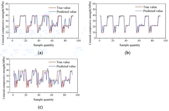 The comparison between the predicted results and the actual values of the load strength of surrounding rock points from 92 test samples, utilizing the class 3 base learners of the AdaBoost ensemble model, is illustrated in Figure 7.