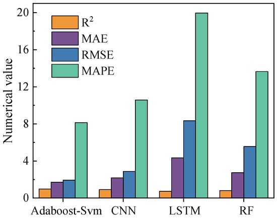 To further verify the advantages of the AdaBoost SVM model, we compared it with other advanced models, including the convolutional neural network (CNN) model based on deep learning, the LSTM model, and the random forest (RF) model based on traditional machine learning. The determination coefficients R2, RMSE, Mae, and MAPE of the three prediction models are shown in Figure 8. It can be found that the R2 value of the AdaBoost SVM model is 0.972, which is significantly higher than 0.917 of the CNN model, 0.725 of the LSTM model, and 0.811 of the RF model, with the highest accuracy. At the same time, the RMSE, Mae, and MAPE of the CNN model are 2.184, 2.866, and 10.580%, respectively. Compared with the CNN model, the AdaBoost SVM model has a smaller deviation between the predicted results and the actual values and has the best robustness. Compared with the LSTM model and the RF model, the CNN model has higher robustness. These comparison results further prove that the AdaBoost SVM model has higher accuracy and stability and is effective and advanced in the task of coal and rock mass strength prediction.