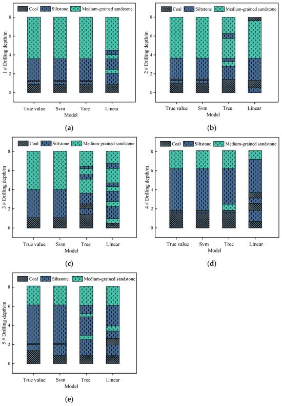 The SVM predictions for drilling holes 1–5 are accurate, except for a coal prediction error of 0.52 m in drilling hole 5. The prediction results for the three types of lithology using the linear model from drill hole 1 are all incorrect, yielding a total accuracy of 83%, while all tree model predictions are correct. In borehole 2, there are errors of 0.5 m for siltstone and 0.51 m for medium-grained sandstone in the tree model, whereas the linear model exhibits errors in predicting the three types of lithology, with accuracy rates of 82% and 76%, respectively. Most predictions from the pore model for drill hole 3 classify siltstone and medium-grained sandstone as different types. The tree model predicts 0.83 m of siltstone as coal, while the linear model predicts 0.47 m as medium-grained sandstone. In drilling hole 4, the tree model only incorrectly predicted 0.64 m of siltstone and medium sandstone, achieving an accuracy of 95%, while the linear model made multiple errors, resulting in an accuracy of only 58%. For drilling hole 5, both model types correctly identified medium sandstone, but errors were present in the predictions for coal and siltstone, with accuracy rates of 78% and 83%, respectively.