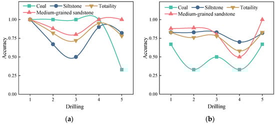 The prediction accuracies of the SVM model for three types of lithology—coal, siltstone, and medium sandstone—are 0.94, 1.00, and 1.00, respectively. The prediction accuracies of the tree and linear models are illustrated in Figure 10. The average accuracies of the tree model for the three types of lithology are 0.86, 0.78, and 0.94. In contrast, the average accuracies of the linear model for the same lithologies are 0.50, 0.80, and 0.81. Among the three models, the highest prediction accuracy is observed for medium-grained sandstone. The SVM and linear models demonstrate greater accuracy in predicting sandstone compared to coal, while the tree model exhibits a higher prediction rate for coal.