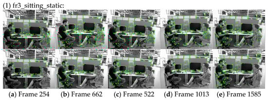 Results of dynamic feature exclusion across four TUM RGB-D sequences: fr3_sitting_static, fr3_walking_halfsphere, fr3_walking_xyz, and fr3_walking_static. For each sequence, subfigures (a–e) represent five moments in time. The top row shows ORB features used by ORB-SLAM3, often affected by dynamic objects. The bottom row shows results from our method, where dynamic features are effectively removed, preserving only static keypoints for improved localization accuracy and robustness.