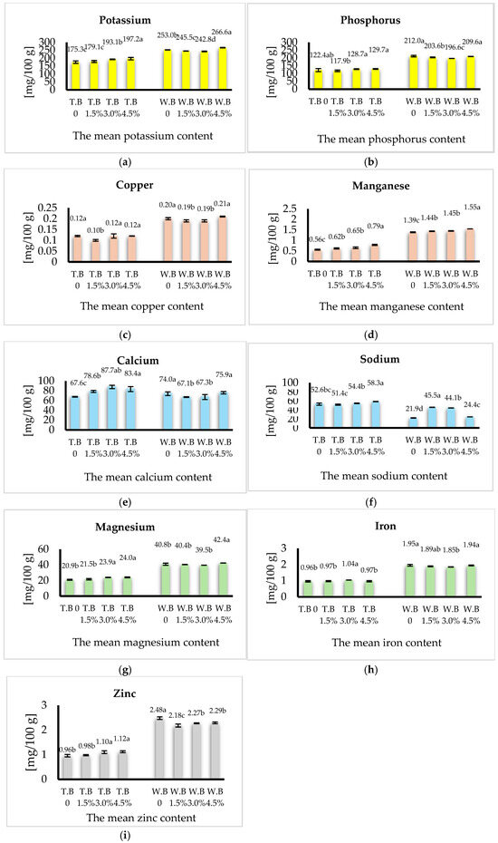 | P [mg/100 g] RDA DDC [%] | 122.4 ± 9.91 ab 700 17.49 | 117.9 ± 4.96 b 700 16.48 | 128.7 ± 2.76 a 700 18.38 | 129.7 ± 2.75 a 700 18.53 | 212.0 ± 4.85 a 700 30.29 | 203.6 ± 2.68 b 700 29.09 | 196.6 ± 0.49 c 700 28.09 | 209.6 ± 0.82 a 700 29.94 |