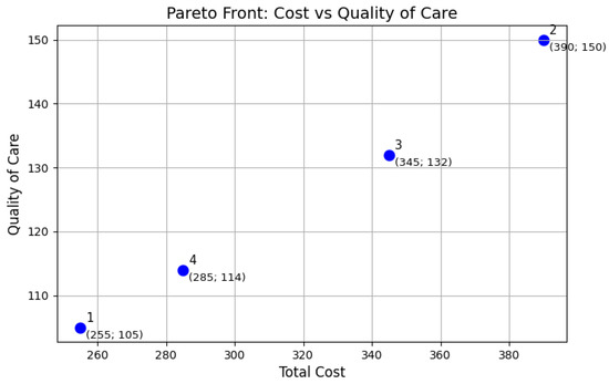 The best solutions appear in the Pareto diagram in Figure 1. The four solutions have divergent costs and qualities, with no single solution dominating the others. The Pareto-optimal zone is situated in the upper-left quadrant of the diagram, symbolizing a combination of low costs and high-quality healthcare services. Solution 1 prioritizes cost minimization, while Solution 2 focuses on maximizing quality of care. Solutions 3 and 4 represent trade-off solutions, balancing cost and quality of care objectives.