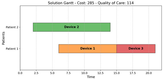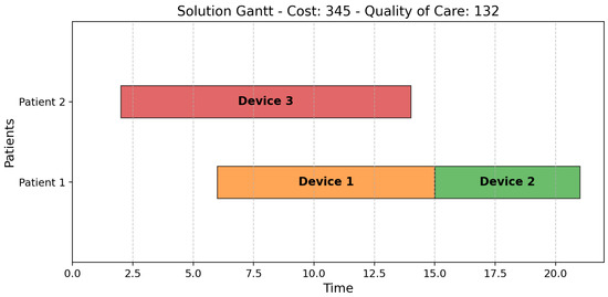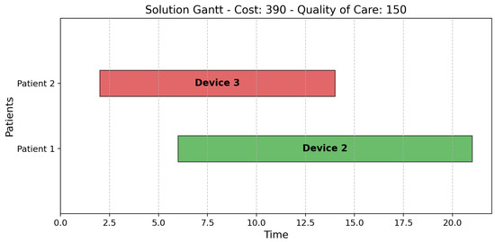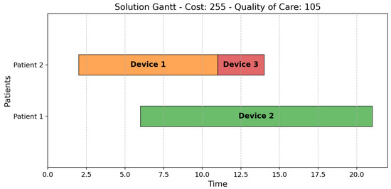 As depicted in Figure 4, Solution 3 assigns the cheapest device (Device 1) to Patient 1, supplemented by Device 2 for the final segment, and the most expensive device (Device 3) to Patient 2. Instead, Solution 4 (Figure 5) reduces costs by switching Devices 2 and 3. Consequently, Solution 4 uses the most expensive device for less time than Solution 3.