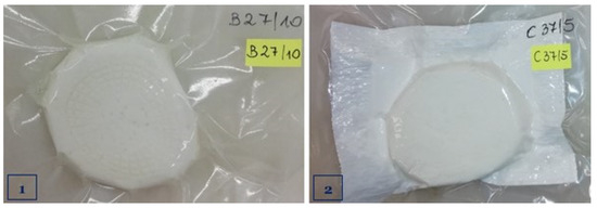Group B and C cheeses (60 cheeses) were placed individually in heat-shrinkable packaging of the multilayer laminate type PET PVdC/CPP (PABEX, Poland; dimensions: 200 × 250 mm; thickness: 41 µm; thermal shrinkage temperature: 145–155 °C) made of high-barrier PET and non-oriented PP film (gas permeability: O2 = 8.73 cm3/m2/24 h/0, 1 MPa, 23 °C, 100% RH; CO2 = 23.89 cm3/m2/24 h/0, 1 MPa, 23 °C, <1% RH; H2O = 4.25 g/m2/24 h, 38 °C, 90% RH). Group C cheeses (30 cheeses) were vacuum-packaged with MEGA CO2 absorbent pads (POMONA, Żyrardów, Poland; dimensions: 120 × 80 mm; all side edges closed) (Figure 1). All the samples were sealed in a PP-15 Tepro Vacu Tronic 2000 single-chamber vacuum sealer (Tepro S.A., Koszalin, Poland) by removing 98% of the air.