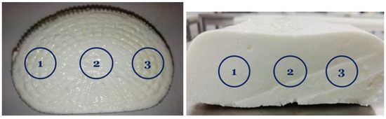 The color of the goat cheeses was determined based on the values of parameters L*, a*, and b* in the CIELAB color space [18], measured by the reflectance method with the HunterLab MiniScan XE Plus instrument (Hunter Associates Laboratory Inc., Reston, VA, USA), directly on the surface and at the cross-section of the cheese samples. Each measurement was conducted in triplicate, at the same points (Figure 2), with D65 standard illuminant, 10° observer, and aperture diameter of 2.54 cm. The measurements were performed immediately after removing the cheeses from refrigerated storage at a temperature of 4 ± 1 °C, before and after each analyzed storage period. The instrument was calibrated with the use of black and white tiles before each series of measurements.