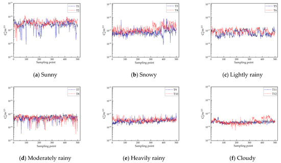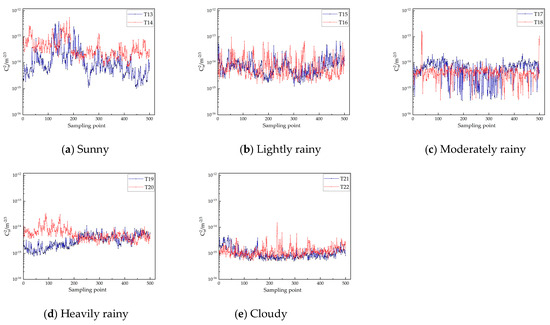 During the experiment, to calculate the changes in turbulence in the current area under different sampling points, it is necessary to organize the measurement samples collected in the experiment. First, the light intensity value is normalized. Then, during the data processing, we further divide the light intensity value into several groups and then calculate its mean and standard deviation. The value of is calculated with the help of Formulas (2) and (3). Finally, the changes in under different weather conditions can be obtained, as shown in Figure 2 and Figure 3.