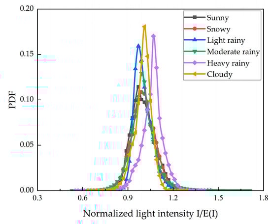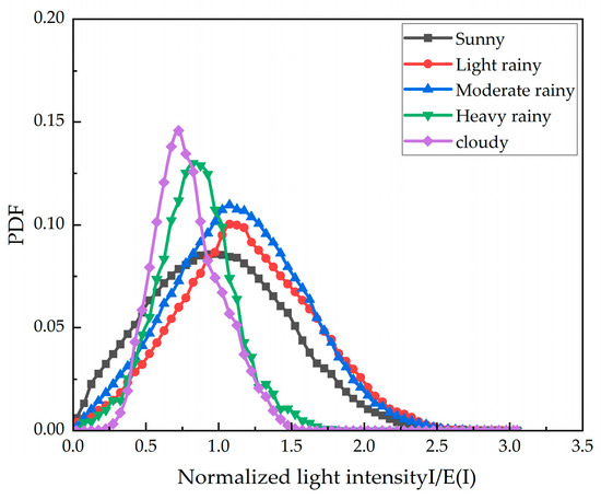 To date, there has been extensive research on the probability distribution characteristics of light intensity flicker. It is generally believed that in areas with weak light intensity flicker, the probability distribution of light intensity flicker follows a log-normal distribution, and its probability density function can be expressed as follows: From weak fluctuations to strong fluctuations, the probability distribution of light intensity flicker follows a Gamma–Gamma distribution [20]. Under strong fluctuation conditions, the probability distribution of light intensity fluctuations follows the K distribution; when the communication link length reaches several thousand meters, in the turbulent saturation zone, the probability distribution of light intensity fluctuations exhibits a negative exponential distribution [21].