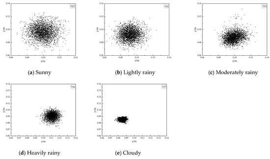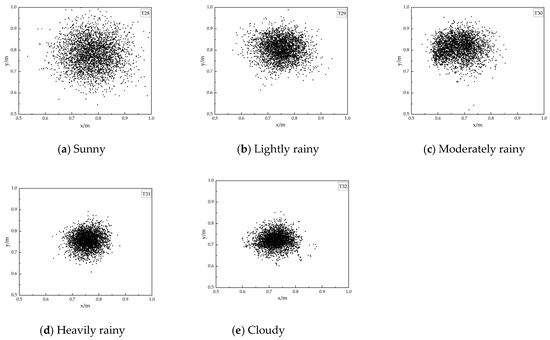 A 256 × 256 pixel window was selected to observe the areas of 0.8 km and 4 km transmission distances. Taking the lower left corner of the image as the origin, the centroid data were converted to the actual scale, and the data within the same transmission distance were restricted to the same coordinate scale. To ensure the consistency of the data, samples at around 9 pm in each weather condition were selected as observation objects. Figure 6 is a distribution diagram of the centroid of the light spot on a sunny day at a transmission distance of 0.8 km, and Figure 7 is a distribution diagram of the centroid of the light spot on a cloudy day at a transmission distance of 4 km. It can be seen from the two figures that whether at a distance of 0.8 km or 4 km, the range of the centroid distribution decreases in the order of sunny days, light rain days, moderate rain days, heavy rain days, and cloudy days. The size of the centroid position distribution range reflects the difference in turbulence strength to a certain extent, which is consistent with the law obtained above.