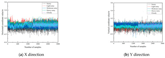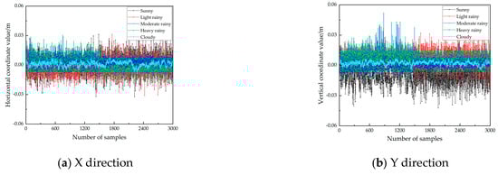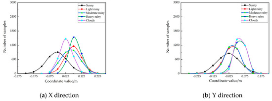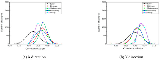 The changes in the light spot center under different weather conditions are shown in Figure 8 and Figure 9, which are the x direction and y direction coordinates of the light spot center of the two links, respectively. In most samples, the fluctuation amplitude of the light spot center position in the x direction is significantly larger. In each group of light spot center change graphs, the amplitude of curve fluctuation also decreases in the order of sunny day, light rain day, moderate rain day, heavy rain day, and cloudy day. Figure 10 and Figure 11 show probability density distribution diagrams of the light spot centroid coordinates in different weather conditions for the two links, which are the probability density distributions of the light spot centroid in the x direction and the y direction, respectively. A total of 3000 sets of samples were collected for each set of data. It can be seen from the figures that under the same weather conditions, the probability density distribution interval in the x direction is larger than the probability density distribution interval in the vertical direction, and the peak probability value of the probability density in the x direction is mostly smaller than the peak probability value in the y direction. In most data, the drift amount in the horizontal direction is often greater than the drift amount in the vertical direction, indicating that the x direction is more significantly affected by turbulence than the y direction. The peak probability values of each weather type gradually increase from sunny to light rain, moderate rain, heavy rain, and cloudy, corresponding to the gradual decrease in the centroid distribution range.