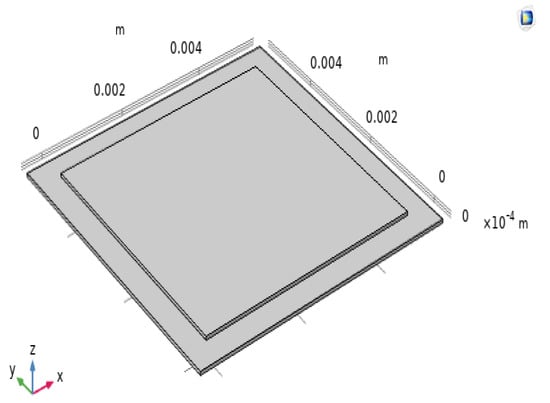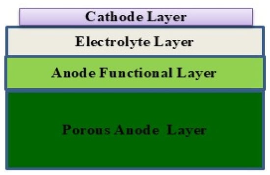 The model was used to simulate the characteristics of a rectangular flat-plate electrode’s porosity for cells with an anode size of 6 cm × 6 cm. The cell structure is shown in Figure 1. Figure 2 illustrates the simulation model of a cell unit. The cell was simulated with four main components as follows: a cathode layer of 30 μm (5 cm × 5 cm); an electrolyte layer with a thickness of 18 μm; an anode functional layer and anode layer with thicknesses of 20 μm and 540 μm, respectively; and uniform dimensions of 6 cm × 6 cm. The parameters of cell electrodes are shown in Table 1.