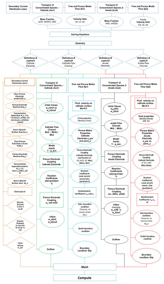 Figure 3 shows the meshing of the cell model according to appropriate input and output dimensions with the individual dimensions of each electrolyte and the boundary layers of the SOFC model. The model comprised three main layers with different dimensions and had a small thickness compared with the width of the layers. It had flat boundary edges with 2D linear elements as triangles with straight sides. In the square fuel cell mode, a separate uniform mesh distribution was applied to each boundary layer according to the setting steps on the model for the cathode, anode, and electrolyte layers, with mesh dimensions of 34 × 120, 75 × 108, and 75 × 2400, respectively. These were suitable with the mesh dimensions for the three main layers of the model along with the operating pressure of the electrodes, in which the flow rate of inlet hydrogen was 200 mL·min−1 (with 3% H2O) on the anode and that of oxygen was 400 mL·min−1 on the cathode. The boundary conditions for the inlet hydrogen electrode side are defined as pressure with no viscous stress. Zero flux is specified in the electrodes and electrolyte layers. The pressures are fixed as atmospheric pressure (1 atm). The boundary conditions at the exits are limited to convective flux. The temperature boundary conditions on the anode and cathode sides are set to the operating temperatures of 650 °C, 700 °C, and 750 °C. After setting boundary conditions and physical establishment for the model, the model is meshed according to the appropriate input and output dimensions with the model shape in accordance with the individual dimensions of each electrolyte and boundary layer. The procedure for developing the simulation model is shown in Figure 4.