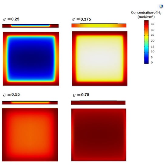 Distribution of H2 in the hydrogen electrode of the SOFC at T = 650 °C, V = 0.19 V, and porosities (ε) of 0.25, 0.375, 0.55, and 0.75.