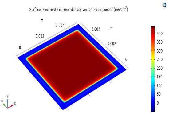 The distribution of current density on the SOFC’s electrolyte layer surface is shown in Figure 7. As shown in the figure, the largest current density on the SOFC’s electrolyte layer surface is 400 mA·cm−2, distributed evenly on the active surface, which has dimensions of 5 cm × 5 cm. The current concentration in the outer area around the active surface is 350 mA·cm−2, and it decreases with increasing distance. This is because the active area of the cathode and the contact area with hydrogen and oxygen fuels is 25 cm2 (5 cm × 5 cm). Therefore, the current concentration is distributed very evenly across the active surface.