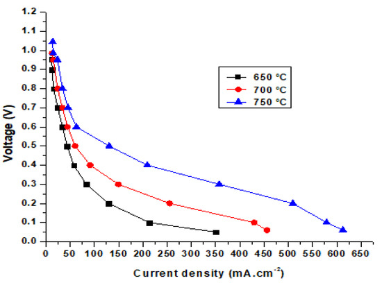 Figure 8 shows the current and voltage density of the SOFC operating at temperatures of 650, 700, and 750 °C. The comparison shows that the simulation results conform to theoretical parameters. As the working temperature increases, the voltage and current density of the cell also increase. This happens because of the increase in the ionic conductivity of the electrolyte and the electrochemical reaction at the electrodes at higher temperatures.