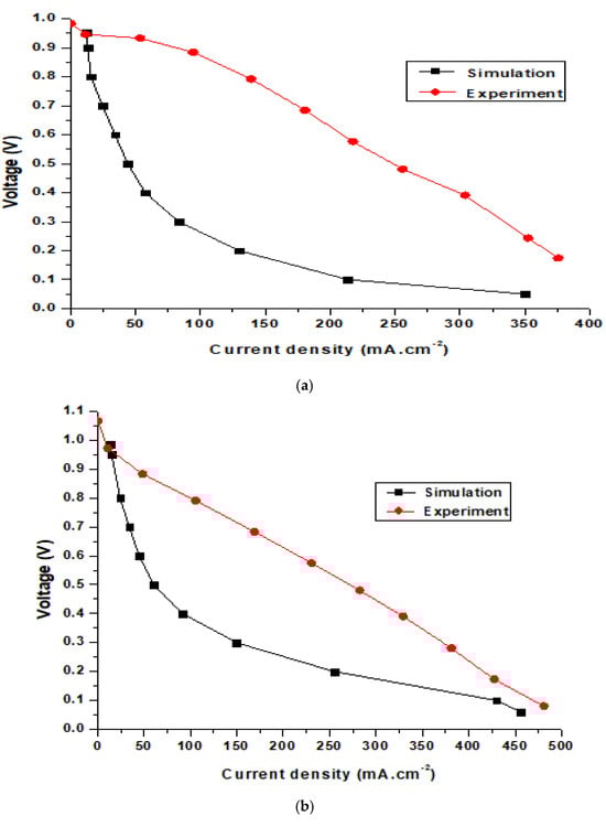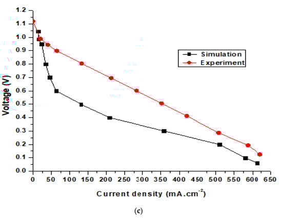 As shown in the figure, the simulation performance curves show slight differences compared to the experimental data. This occurred because the experimental tests were conducted in a much shorter time than the simulation model. The iteration step in the experiment tests is also much shorter than in the simulation. In addition, determining the key parameters from the experimental tests is difficult. Moreover, the error of the testing machine for current density is about 5%. It can be seen that the power density of the homemade cell is far below the state-of-art in SOFC technology, possibly due to inconsistent cells fabricated manually in the lab. Cell performance depends on the cell fabrication skill. In this work, commercial materials were used to manually manufacture the cells, and achieving consistency in cell performance remains a challenge.