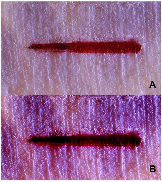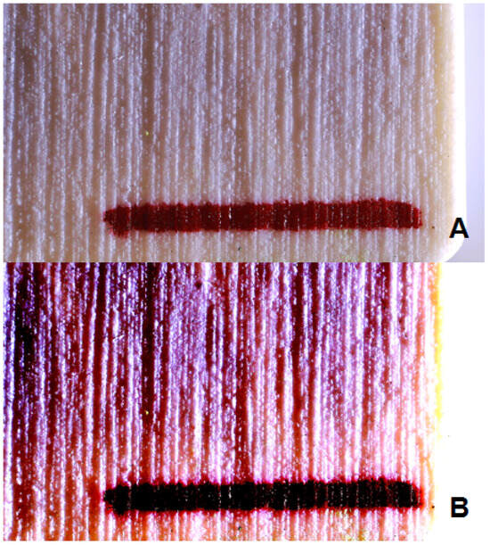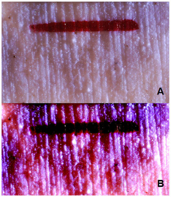 During the visual assessment of the plates surfaces, magnified photographs were taken. Photographs before and after the filter was applied are shown in Figure 4, Figure 5, Figure 6 and Figure 7. The red sections visible in the photos are the measurement sections of 1 cm, for which the number of grooves was counted (Table 3).