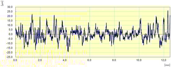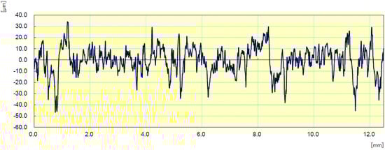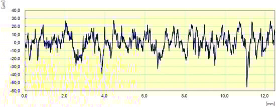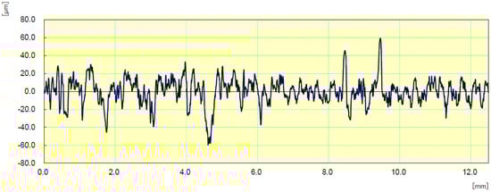 To determine the profile of a given surface, a number of contact or non-contact methods may be applied, each of which differs in the simplicity of the application under given laboratory conditions, the range of roughness to be measured, and the ease of handling the output data []. In addition, more precise methods for the measurement and processing of surface profiles are still being developed [,]. In this study, the contact method for roughness measurement was chosen. For this purpose, a SURFTEST SJ-410 surface roughness tester (software Ver. 2.00) from Mitutoyo (Kanagawa, Japan) was used, and the following three parameters were measured: