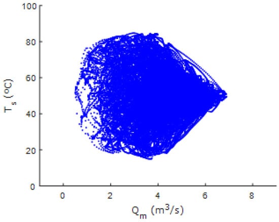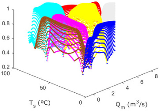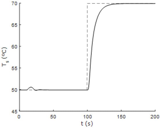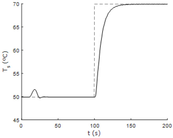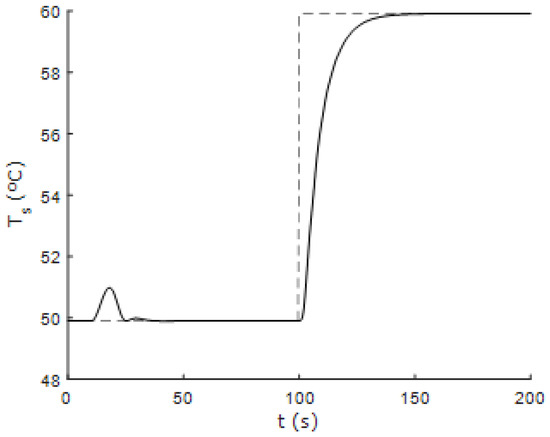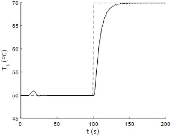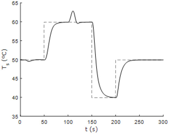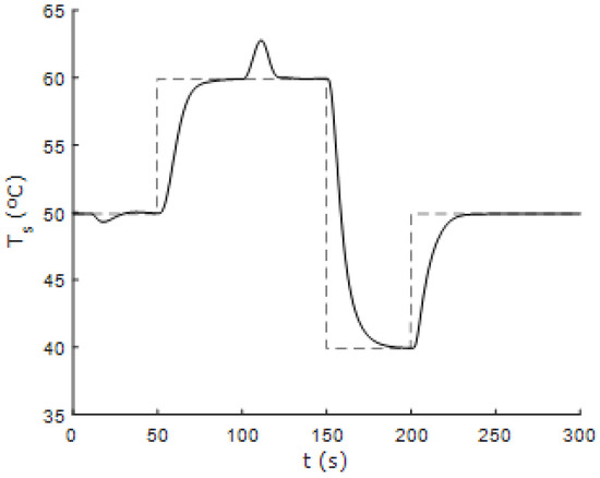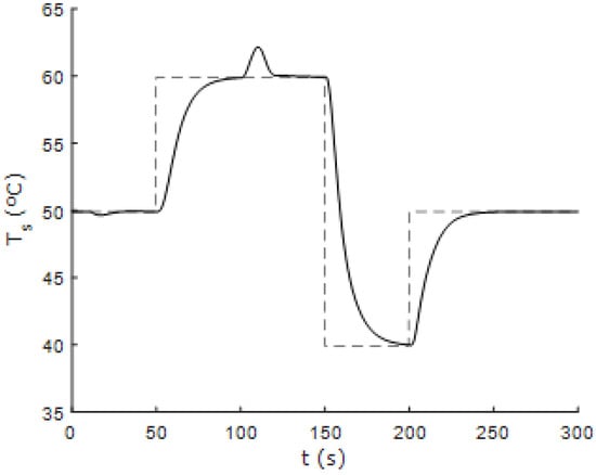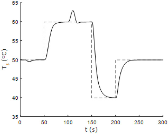 Figure 31 and Figure 32 show the response of the system controlled by the GG algorithm when the system is subject to changes in the reference values of the flow and temperature. Furthermore, Figure 33 and Figure 34 show the response of the controlled system to successive changes in the reference signals. It can be seen that the fuzzy controller acts correctly in areas far from the nominal operating point.