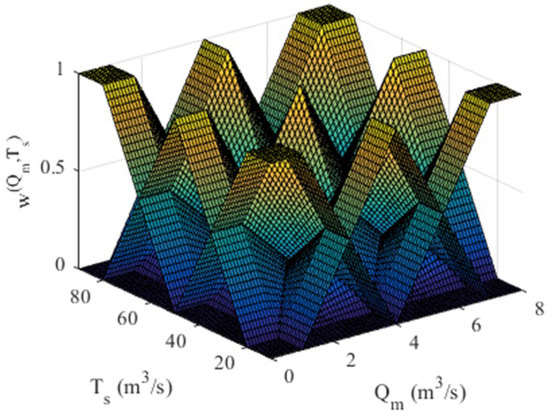 As explained in [6,7], the matrix is non-invertible due to the linear dependency among the columns of X, which makes direct computation of the parameter vector P via the classical expression infeasible. To overcome this limitation, a factor is introduced. This parameter quantifies the confidence degree associated with the initially estimated parameters; its inclusion ensures that the extended matrix maintains full rank even if the triangular membership functions overlap in pairs. Thus, the vector P can be determined by isolating it from Equation (6):