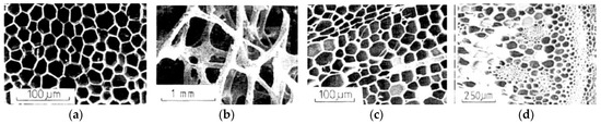 Figure 1. Natural biological structures: (a) oak bark; (b) cellular bone; (c) balsa wood; (d) plant stem [1].