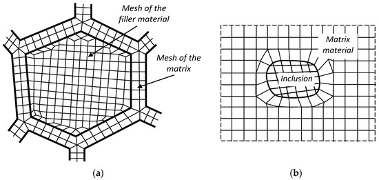 Finite elements can provide a solution to the problem of rare inclusions (Figure 2). In such cases, it is possible to use regular meshes, where four-node elements are the most effective solution. The use of a regular mesh with four-node elements is common in the analysis of periodic composite structures. An example is the use of eigenelements [26,27,28]. The development and improvement of finite elements is often aimed at reducing the time taken and the computational power while maintaining appropriate accuracy of calculations. In addition, there are issues related to the possibilities and methods of homogenization of heterogeneous but periodic structures, especially when it comes to the previously mentioned multi-scale modeling analysis [29]. Periodic systems are typical, especially for composite materials. An example of analysis involves the use of another type of element, the so-called hierarchical method [30]. In many modifications of finite elements, various types of changes are often introduced concerning the shape functions [31], i.e., the distribution of displacements and stress inside the surface of a two-dimensional element.