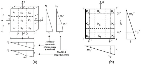 In the standard approach, it is assumed that the shape functions do not change and remain linear (Figure 5a). Such an interpretation is justified for small differences in the stiffness of individual sub-areas of the finite element, because the effect of changing the displacement field is not so significant. For greater differences in stiffness, such an approach leads to increasingly large calculation errors and modification of the displacement field inside the finite element is obvious. Modification of the displacement field is in the form of broken shape functions (Figure 5a). For a two-dimensional element, the shape functions are the surface resulting from the components about the ξ and η axes, described by the coefficients m1′, m2′, …, mi′ and m1″, m2″, …, mi″, respectively (Figure 5a).