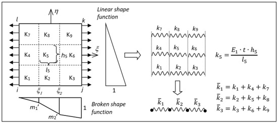 According to the determined method, the multi-area element could be replaced by a system of connected springs. In Figure 6 and Figure 7, the basic idea of determining the matrix parameters for the direction of horizontal axis ξ and vertical axis η are presented, respectively. Taking into account linear deformations, it is assumed that the equivalent spring system creates a model defined by series-connected springs. Using the determined stiffness parameters k, the values of mi coefficients are calculated [36].