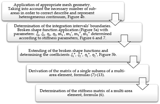The presented process of deriving the stiffness matrix of the multi-area element has been described in detail. To enhance comprehension, an explanatory diagram of the consecutive steps of the procedure has been developed and is shown in Figure 8.