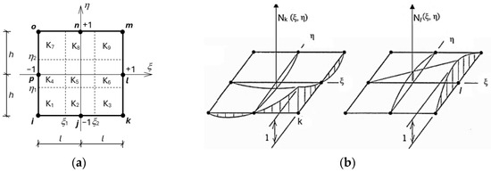 Based on the four-node element, an eight-node element was also developed (see Figure 9a). Examples of the shape functions used are shown in Figure 9b.
