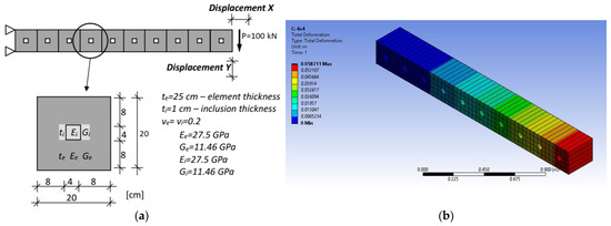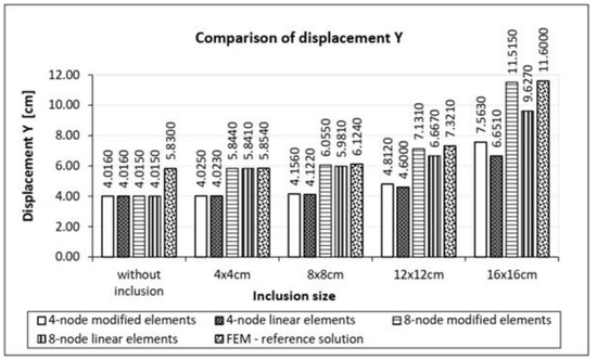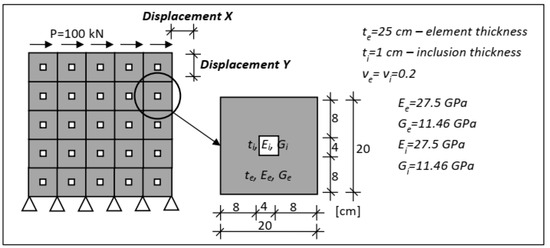 The proposed method and its assumptions were verified using the example of displacements calculations of a structure consisting of elements in the plane state of stress (Figure 10). The tests presented are analogous to the elements or the parts of the structures made of non-homogeneous materials, containing areas with variable stiffness characteristics. The structure consists of square elements 20 × 20 cm with a thickness of 25 cm containing centrally located inclusions in the form of a weakening cross-section with a thickness of 1 cm. The centrally located inclusions have the following sizes: 4 × 4 cm, 8 × 8 cm, 12 × 12 cm, 16 × 16 cm. In all variants, the total load was 100 kN in the form of a uniformly distributed load applied to the edge of the structure.