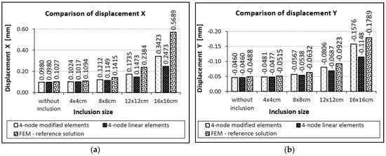 Figure 11. Displacement values for model of heterogeneous structure: (a) on the X-direction; (b) on the Y-direction.