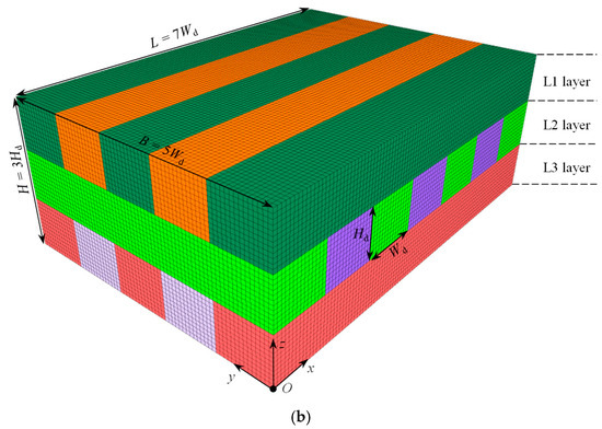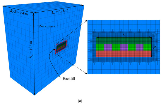Figure 2 shows the numerical model built with FLAC3D (v6.00) of the stope with a basket weave drift layout surrounded by a rock mass. Figure 2a illustrates half of the established model prior to excavation. The sizes of the numerical model are set as Lr = Br = Hr = 128 m to minimize boundary effects. The model comprises two regions: the ore rock in the stope and the surrounding rock mass. During subsequent mining and backfilling operations, ore rock in the stope is progressively replaced by the backfill. As shown in Figure 2b, the stope consists of three layers, labeled L1, L2, and L3 from top to bottom. Among them, L1 and L3 contain five drifts oriented along the x-axis, while L2 contains seven drifts oriented along the y-axis. Drifts in adjacent layers are arranged perpendicularly to simulate the basket weave drift layout. All drifts have identical dimensions, with a span of Wd and a height of Hd.