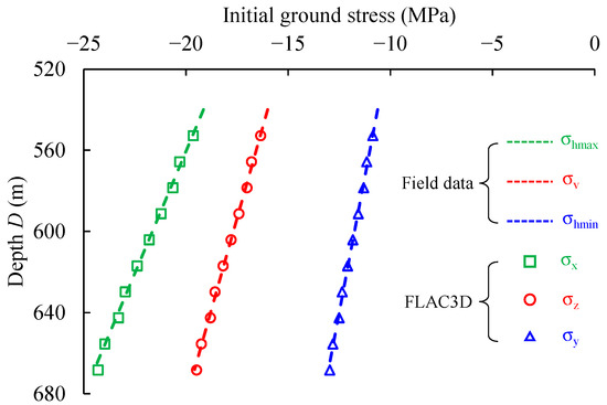 The σhmax, σhmin, and σv are employed to generate the initial values of the stress components σx, σy, and σz in the numerical model. Specifically, the coefficients 0.04172, 0.01876, and 0.028 in Equation (2) are used to compute the gravity-induced stress gradients of the σx, σy, and σz, and the initial ground stress can form due to the gravity and the applied surcharge on the top boundary of the model. To examine the validity of the formed initial stress based on the in-site data, stress components are extracted along a vertical line connecting the centroids of the model’s top and bottom surfaces. These values are then compared with the ground stress obtained from Equation (2). The average interpolation method in FLAC3D is used to extract the stress components and for the subsequent contours, which means the values of zone-based data are averaged to grid points and linearly interpolated to the zone interior [18].