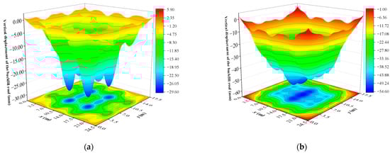 Figure 4 illustrates the vertical displacement distribution of the backfill roof at L2 and L3 (monitoring planes located at z = 6 m and 3 m, respectively) after the secondary drifts at L3 are excavated. The cohesion of the backfill roof was assigned a value of 425 kPa, under which no plastic failure occurs. The vertical displacements vary smoothly across different locations of the roof and exhibit a downward-concave distribution pattern. In Figure 4a, certain areas of the roof at L3 exhibit higher vertical displacement, which leads to a columnar distribution pattern. The maximum displacement of 2.9 cm takes place near the intersection of the secondary drifts of L3 and L2. In Figure 4b, the vertical displacement of the roof at L2 shows a strip-like distribution parallel to the y-axis, with a maximum value of 5.4 cm located in the central drift of L2. These are similar to previous observations that the vertical displacement of the backfill roof exhibits a wave-like distribution along the direction of drift width [25,27]. However, they did not give further explanations of the findings.