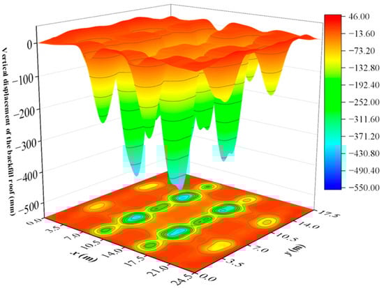 This section analyzes the displacement distribution characteristics of the backfill roof with the basket weave drift layout in stable and unstable states. The numerical results presented are based on the case with a drift size of 3.5 m × 3.0 m.