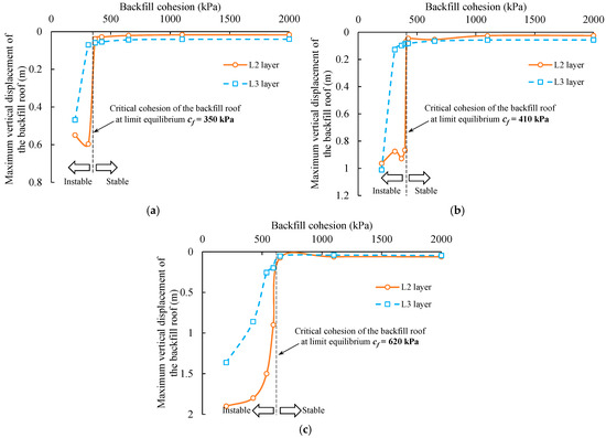 Figure 6b,c illustrates the variations in the maximum vertical displacement of the backfill roof with different cohesion in cases with drift sizes of 4.5 m × 4.0 m and 5.5 m × 5.0 m, respectively. It is evident that a sharp change in displacement occurs at c = 410 kPa and 620 kPa, and the strength requirements of the backfill roof were determined accordingly. Clearly, the strength requirement increases with the drift size. This aligns with previous reports that the required strength of base-exposed backfill increases with the span [23,28].